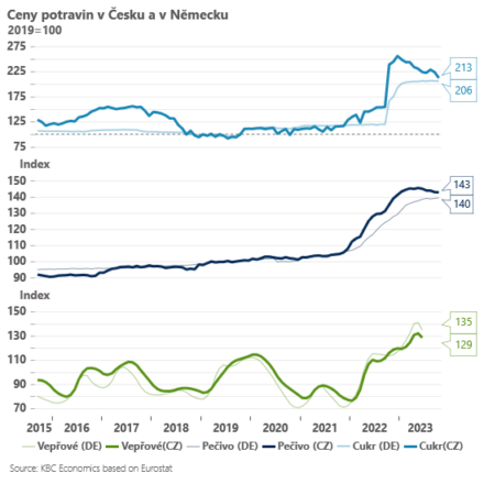A za druhé, při pohledu do zpětného zrcátka se zdá, že od roku 2019 se nevyvíjely ceny hlavních potravin dramaticky odlišně od sousedního Německa (viz grafy). Ceny zemědělské produkce se postupně jak v Česku, tak v Německu odrážely v podobné intenzitě ve výrobním řetězci a následně i na pultech obchodů. Potraviny tak v průměru oproti roku 2019 zdražily zhruba o 35 % jak v Česku, tak i v Německu. Rozdíly v cenách některých produktů, které pozorují při přeshraniční turistice čeští spotřebitelé, tak tady byly s vysokou pravděpodobností již před pandemií covidu. U některých produktů (tuky a oleje) sice rostly ceny na pultech v Česku o něco výrazněji, než ukazují ceny zemědělců i pohyb cen v Německu, v případě jiných produktů (například masné výrobky) je tomu ovšem naopak. A k podobnému závěru ve svém šetření pravděpodobně dospěl u hlavních potravin i Úřad pro ochranu hospodářské soutěže.