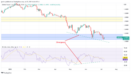Jak můžeme vidět na grafu 1, GBPUSD je na víceletém supportu, který si drží svou pozici. Při pohledu na graf 2 vidíme divergenci, která by mohla znamenat možný obrat ceny.