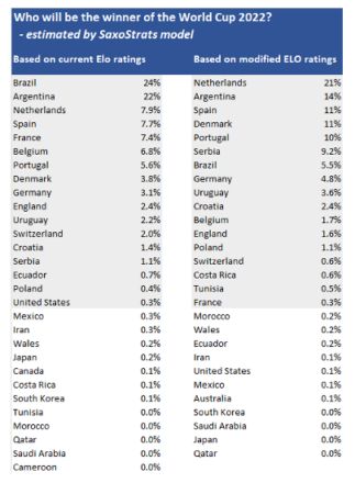 Ve světě dnes řádí pádivá inflace a podobná inflace zachvátila i fotbalový svět. Univerzity, sázkové kanceláře, fanoušci i banky se předhánějí v prognózách, který tým vyhraje letošní mistrovství světa. Při pohledu na ně však člověka zarazí jejich až přílišná podobnost. Vzhledem k tomu, že všechny vycházejí z koeficientů Elo, se není čemu divit. Náš tým jde ale rád proti proudu. Byť jsme se také pustili do kvantitativní hry s pomocí koeficientů Elo a metody Monte Carlo, upravujeme tyto koeficienty na základě pěti faktorů, což vede k překvapivě nekonsensuálním predikcím. Nejvyšší pravděpodobnost vítězství tak má podle nás Nizozemí.