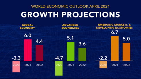 Globální ekonomika v tomto roce vzroste o 6 %, oproti 5,5% tempu odhadovaného v lednu, uvedl MMF ve svém světovém ekonomickém výhledu zveřejněném v úterý. To by bylo nejvíce za poslední čtyři desetiletí, které by následovalo po 3,3% poklesu v minulém roce, kdy nastal nejhorší pokles od velké hospodářské krize.