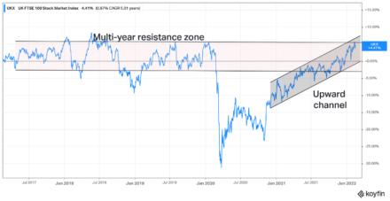 Obrázek 1: Index FTSE 100, pětiletá výkonnost, denně (Zdroj: koyfin.com)