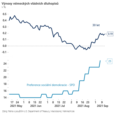 Výraznější hlas zelených (než FDP) v nové koalici by znamenal expanzivnější rozpočtovou politiku a více regulace, což by pravděpodobně vedlo k růstu výnosů dnes stále extrémně nízko úročených německých bundů ( potažmo plusové body pro euro). Ještě větší reakci na trzích by přivodila stále relativně málo pravděpodobná „levicová koalice“ (SPD, zelení a post-komunistická Die Linke). Je si však třeba uvědomit, že jakákoliv koaliční dohoda se bude ve více fragmentovaném Bundestagu pravděpodobně hledat delší dobu a bude velice složitá – jinými slovy, okamžitá reakce na povolební výsledky nemusí být výrazná. Zvlášť proto, že trhy již částečně možnost levicovější koalice zahrnuly do dnešních cen – výnosy německých bundů šly s rostoucími preferencemi SPD vzhůru. Pro eurodolar proto nakonec tak jako tak asi bude důležitější sledovat, jak moc se rozhodne v září americký Fed komunikovat obrat v měnové politice.