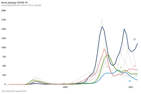 Pohled do zbytku Evropy, který je určující pro zahraniční poptávku, však zdaleka tak pesimistický není. V sousedním Německu jsou přírůstky nových nakažených (po přepočtu na obyvatele) oproti Česku zhruba desetinové, dál klesají a od pondělka vedly naopak k uvolnění vládních nařízení – do škol se vrátili žáci základních škol a otevřeli se opět kadeřnictví a některé další vybrané služby. Rozvolňování má postupovat v dalších pěti krocích…, za předpokladu, že se bude situace dál vylepšovat (od 8.3. se teoreticky mohou otevřít sportoviště pro 10 a méně sportovců). To je ostrý kontrast oproti Česku, kde je situace “nezvládnutá” a naopak vedla k nejtvrdším opatřením od jara 2020. V Itálii a Francii se situace v posledních týdnech začala na rozdíl od Německa lehce zhoršovat, přírůstky nově nakažených jsou ale i tak oproti Česku zhruba čtvrtinové. I proto je pravděpodobné, že česká ekonomika bude za zbytkem Evropy v prvním a pravděpodobně i druhém kvartále zaostávat.