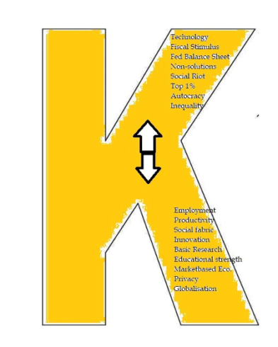 Fed put a víra v něj znamenají, že mohou finanční instituce už od roku 1998 bez obav riskovat, sklízet veškeré potenciální výhody a zároveň se vyhýbat případným nevýhodám, protože vědí, že když to nevyjde, vždy je někdo zachrání. Ale i toto paradigma brzy skončí v propadlišti dějin, protože nejnovější gigantická verze Fed putu, která má pomoci vyřešit krizi kolem Covidu-19, rozštěpila naši společnost vedví – a to doslova, protože výsledkem je takzvané zotavení do K.