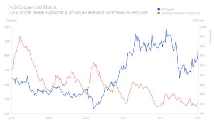 Průmyslové kovy vedené mědí a hliníkem vstoupily do roku 2023 velmi optimisticky. Mohly za to spekulace, že Čína jako největší světový spotřebitel vystupňuje podporu své ekonomiky podobně jako v letech 2003 (po vstupu do WTO), 2009 (po Velké recesi) a 2016 (po devalvaci měny). Jde totiž o to, aby se nastartovalo hospodářské zotavení, které by zmírnilo hospodářské dopady neúspěšné a nyní již ukončené politiky nulové tolerance COVIDu prezidenta Siho. Tento optimismus dál posiluje dolar oslabující kvůli spekulacím, že Federální rezervy už budou úrokové sazby zvyšovat pomaleji, protože očekávaná inflace nadále klesá.