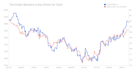 Prosincové momentum se díky slabšímu dolaru přeneslo i do ledna, a zlato tak s počátkem roku 2023 vyrazilo jako o závod. Stříbro mělo zpočátku problém držet krok, ale vzhledem k tomu, jak dobře si podle nás povede měď, si myslíme, že má šanci do roka výsledky zlata překonat. Tento obrat oproti roku 2022 by mohla přinést změna dříve nepříznivých faktorů, tedy silnějšího dolaru a rostoucích výnosů z dluhopisů, protože slabší dolar a klesající výnosy by byly pro stříbro naopak příznivé.