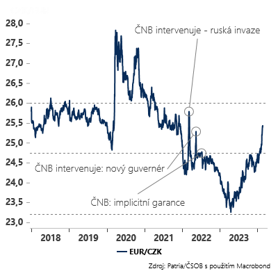 Z těchto důvodů nevylučujeme, že se koruna může v nejbližších týdnech pokoušet opakovaně testovat úrovně v okolí 25,50 EUR/CZK (úrovně kam oslabila po jmenování nového guvernéra Michla), a pokud by se jí to povedlo, není teoreticky vyloučený pokles až k úrovním, kam oslabila po startu ruské invaze na Ukrajinu (25,90 EUR/CZK). V takovém případě by to mělo pravděpodobně dopad do dalšího zpomalení/eventuálně zastavení poklesu úrokových sazeb v Česku a ztráty koruny by se pak ukázaly jako dočasné. K reakci ČNB by však došlo se zpožděním, a právě proto v nejbližších týdnech/měsících nelze vyloučit výraznější volatilitu české měny.