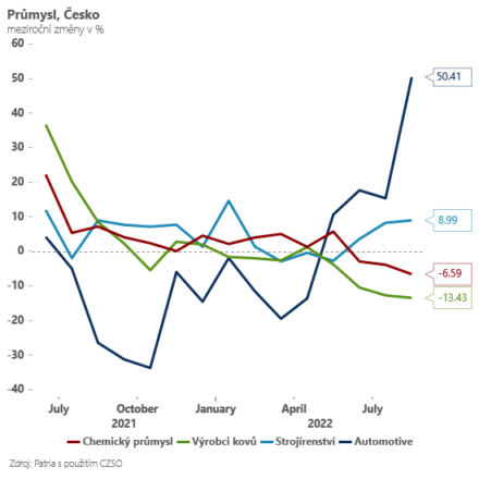 Celková čísla z průmyslu výrazně zkresluje zejména automotive, jehož produkce byla v srpnu meziročně přibližně o 50 % vyšší. Přesně před rokem však vrcholil “čipový hladomor” a výroba byla velice nízká. Na druhou stranu v srpnu podobně jako v červenci už neplatilo, že automotive je jediným tahounem českého průmyslu. Spíše se ukazuje, že napříč průmyslem jsou velké rozdíly mezi jednotlivými odvětvími a pravděpodobně i firmami. Relativně dobře se daří strojařům (+9 % meziročně) nebo výrobcům elektrických zařízení (+9,6 % meziročně). Na druhé straně pod velkým tlakem jsou energeticky náročná odvětví, jako je výroba základních kovů, hutnictví a slévárenství (-13,4 % meziročně) nebo chemický průmysl (-6,6 % meziročně).