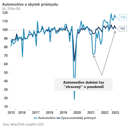 Průmysl v dubnu lehce přišlápl brzdový pedál. Meziroční dynamika zvolnila z 2,9 % na 1,2 %. Meziročně zůstává průmysl dál v plusu zejména díky sektoru automotive – i když meziměsíčně šla produkce dolů, meziročně je díky nižší srovnávací základně stále sektor automotive ve výrazném plusu (+30 %).