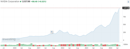 Celkové příjmy společnosti NVIDIA za první čtvrtletí fiskálního roku 2025 (období od 29. ledna do 28. dubna 2024) činily 26 miliard dolarů, což je meziroční nárůst o 262 %. Konsenzuální očekávání tržeb bylo na úrovni 24,7 miliardy USD. Tyto příjmy byly masivně podpořeny zejména příjmy z datových center, které dosáhly historického maxima 22,6 miliardy USD, což je o 427 % více než ve stejném období loňského roku. Aby toho nebylo málo, čistý zisk společnosti vzrostl oproti 1. čtvrtletí fiskálního roku 2024 o 628 % na 14,9 miliardy USD a čistá zisková marže činila neuvěřitelných 57 %, což je pro tak obrovskou společnost, jako je NVIDIA, nebývalé číslo. Jen pro srovnání, čistá zisková marže Microsoftu za poslední čtvrtletí činila přibližně 35 %, zatímco marže Applu dosáhla 26 %. Finanční výhled společnosti NVIDIA na příští čtvrtletí rovněž překonal očekávání – společnost stanovila předpokládané tržby na 28 miliard dolarů, zatímco odhady analytiků hovořily o zhruba 26,7 miliardách dolarů. [1] V návaznosti na tuto zprávu překonaly akcie společnosti NVIDIA hranici 1 000 USD.* Kromě toho společnost také oznámila rozdělení akcií v poměru 10:1, které vstoupilo v platnost 7. června tohoto roku.