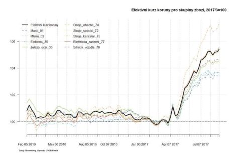 Dovozci a vývozci kancelářských strojů a elektroniky proto od konce intervencí čelí posílení kurzu výrazně agresivnějšímu než zbytek ekonomiky (+7,3 %). Naopak zboží, které se primárně obchoduje s eurozónou a zeměmi ve střední a východní Evropě – maso, mléko – čelí posílení o poznání mírnějšímu (+3,3 %) – viz grafy níže.