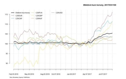 ČNB se však nedívá na vybrané sektory, ale na ekonomiku jako celek a to v širších souvislostech. A tady je realita jednoduchá. Stoupáme k vrcholu hospodářského cyklu a kurz koruny vůči euru ani celkový efektivní kurz nijak dramaticky neposilují. Na to centrální bankéři v poslední prognóze přitom sázeli. A současně počítali s o poznání slabším růstem.