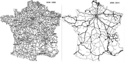 Níže uvádím nejlepší mapu, jakou jsem dokázal najít, která ukazuje, jak dochází k opouštění těchto venkovských oblastí: jde o vývoj francouzské železniční sítě od roku 1910 do roku 2014. Jak je vidět, v roce 1910 mělo každé menší město vlakové spojení s metropolí, ale od té doby se veřejná politika zaměřuje jen na pár měst, což vedlo k uzavření většiny menších tratí.