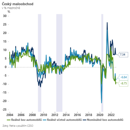 Čísla z maloobchodu potvrdila, že spotřebitelská recese v Česku s vysokou pravděpodobností dál pokračovala i na konci roku 2022. Meziměsíčně maloobchod v listopadu dál klesal (o 0,3 %), což znamenalo meziroční pokles o 8,7 %. Oproti před covidovému roku 2019 jsou v průměru sice útraty domácností v obchodech nominálně o necelých 20 % vyšší, reálně si však za peníze lidé nakoupí zhruba o 6 % méně. Tržby přitom reálně klesají prakticky ve všech typech obchodů (s výjimkou kosmetiky) s tím, že poněkud překvapivě největší propady zaznamenávají prodejny potravin (jak specializované, tak ostatní). To ukazuje, že značná část Čechů pod tlakem vysoké inflace a padající reálné mzdy hledá úspory i v základních výdajích