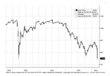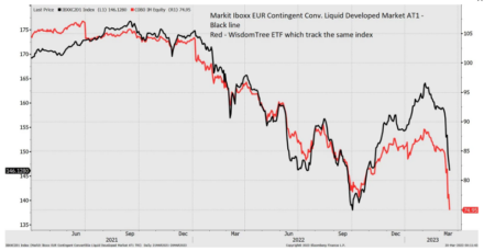 I když nejspíš nejde o nejlepší ukazatel, existuje fond ETF společnosti WisdomTree, který kopíruje právě vývoj tohoto trhu – všimněte si, že níže uvedený graf končí pátečním uzavřením trhu. Credit Suisse tvořila o něco víc než 7 % tohoto indexu a tato část má teď nulovou hodnotu.