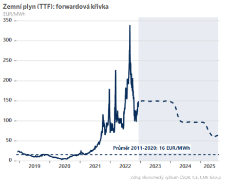 Na druhou stranu, je třeba počítat, že plyn zůstane výhledově drahý. To ostatně indikuje i forwardová křivka (viz graf), podle které se tuto ani příští zimu ceny výrazně pod 100 EUR/MWh nepodívají. Při absenci ruských dodávek plynu (a tedy přetrvávajícímu relativnímu nedostatku) jsou vysoké ceny plynu potřeba ze dvou důvodů: jednak aby Evropa přilákala tolik potřebné LNG tankery (v konkurenčním boji s asijskými zeměmi) a jednak, aby byl cenový signál působící ve směru pokračující destrukce poptávky dostatečně silný.