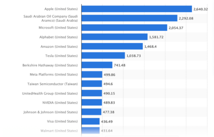 V době psaní tohoto článku činila tržní kapitalizace společnosti Apple více než 2,35 bilionu USD, což znamená, že je nejhodnotnější společností na burze. Pro srovnání, ropný gigant Saudi Aramco se umístil na druhém místě s hodnotou 1,89 bilionu dolarů, na třetím místě Microsoft s 1,90 bilionu dolarů a na čtvrtém Amazon s hodnotou 960 bilionů dolarů.
