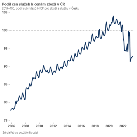 Hlavním zdrojem obav centrální banky je stále trh práce, na kterém zatím došlo jen k minimálnímu ochlazení a mzdová dynamika tak v nejbližších kvartálech zůstane vysoká – poslední čísla z průmyslu ukázala, že v květnu dynamika mezd zrychlila z jednociferných hodnot nad 11 %. Je pravda, že reálná mzda stále meziročně klesá, odeznívající energetická inflace však pravděpodobně v druhé polovině roku přispěje k obnovení lehkého růstu reálné mzdy. A pokud tak tempo růstu nominálních mezd (i zisků) v české ekonomice v nadcházejících kvartálech výrazněji nezvolní, bude návrat k inflačnímu cíli v roce 2024 z principu dočasný. S vysokou pravděpodobností by se pak v ekonomice udržela relativně rychlá inflace služeb. Jsou to právě služby, které jsou méně otevřené mezinárodnímu konkurenčnímu tlaku a jejich nabídka je častokrát v krátkém období méně elastická.