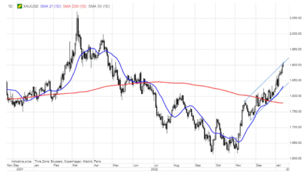 Z krátkodobého hlediska se zdá, že si zlato čím dál víc říká o korekci. Toto riziko zvyšuje i nižší fyzická poptávka, než si obchodníci zvyknou na vyšší ceny – zejména v Indii, kde se podle agentury Reuters poptávka v prosinci ve srovnání s předcházejícím rokem propadla o 79 %. Zlato se od začátku listopadu neobchodovalo pod svým 21denním klouzavým průměrem a po lednovém vzepjetí se mu vzdálilo ještě víc, ale podle RSI to vypadá na překoupený trh, takže nelze vyloučit korekci k nižšímu pásmu, na 1830 USD.