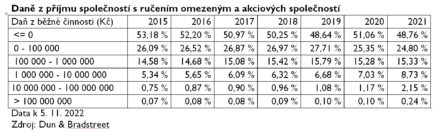 V roce 2021 každá čtvrtá firma zaplatila státu daň z příjmu v rozpětí od jedné koruny do sto tisíc korun. Mezi sto tisíci a milionem zaplatilo 15 procent společností, přičemž podíl společností, které odvádí daně v tomto intervalu je v posledních pěti letech stabilní. Od hranice jednoho milionu korun podíl firem kontinuálně roste. Od milionu do deseti milionů na dani z příjmu odvedlo téměř devět procent společností, zatímco v roce 2020 to bylo sedm procent a v roce 2015 mírně přes pět procent. Stejný trend vykazují firmy s daní v intervalu od deseti do sto milionů korun. V tomto pásmu daň odvádí přes dvě procenta podniků, o jeden procentní bod víc než v roce 2020, zatímco v období mezi lety 2015 až 2018 se jednalo o méně než jednu firmu ze sta. V nejvyšším sledovaném pásmu, nad sto milionů daň z příjmu v roce 2021 do státní kasy zaplatilo 0,24 procent firem, zatímco v letech 2019 až 2020 to bylo 0,1 procent subjektů.