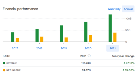 Ve své poslední finanční zprávě za první čtvrtletí roku 2022 společnost vykázala tržby ve výši 27,91 miliardy dolarů, což je meziroční nárůst o 6,64 procenta. Čistý zisk činil 7,47 miliardy dolarů, což je meziroční pokles o 21,40 procenta. Podíváme-li se však na výroční zprávy za posledních pět let, vidíme, že výnosy a čisté příjmy každým rokem rostou.