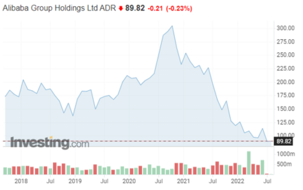 Výsledky akcií Alibaba Group Holdings Ltd ADR za posledních 5 let. Zdroj: investing.com