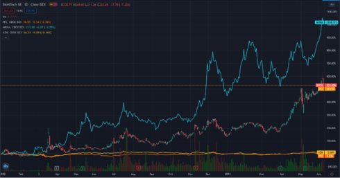 Přiložený graf zaznamenává vývoj ceny akcií od roku 2020. BioNtech (barevný graf) + 531,48 %, Pfizer (oranžová čára) + 5,33 %, Moderna (tyrkysová čára) + 1018,11 % a AstraZeneca (žlutá čára) +12 ,60%.