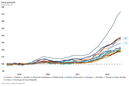 Je pravda, že index světových cen potravin (FAO) začal po extrémním nárůstu klesat již v dubnu 2022. Dopad na ceny zemědělské produkce v EU byl však postupnější a ty dosáhly svého vrcholu zpravidla až v průběhu léta (červenec/srpen) a od té doby postupně klesají – to platí i o Česku.