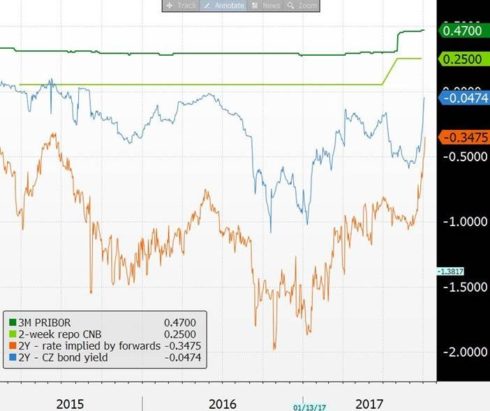 Výnos dvouletého českého dluhopisu se poprvé po více než roce přiblížil nule. To činí z koruny o poznání atraktivnější zboží. Pokud bude trend sbližování tržních a oficiálních sazeb pokračovat, může to ve finále přitáhnout do již výrazně překoupené koruny nový spekulativní kapitál a korunu v dohledné době posílit.