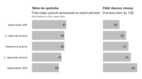 A v neposlední řadě pravděpodobně existují efektivnější způsoby, jak stimulovat poptávku… Plánovaná daňová změna přidá prakticky všem, nejvíce peněz ale paradoxně pošle příjmovým skupinám s nadprůměrnými příjmy. Zatímco lidem s příjmem okolo 30 tisíc přijde na účet navíc zhruba 1500 korun, lidem s příjmy 100 tisíc korun to bude okolo 5000 korun. Značná část daňového stimulu tak skončí v kapsách bohatších domácností, které mají nižší sklon ke spotřebě a hospodářství v těžké chvíli příliš nepomohou (viz graf níže).