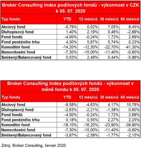 V červnu došlo ke korekci na finančních trzích, jednotlivé skupiny podílových fondů stahovaly ztráty, které zaznamenaly na přelomu února a března. Od začátku roku vykazují akciové fondy výkonnost -5,79 %, pro připomenutí v květnu to bylo -8,90 % v CZK. Posilovaly také fondy fondů, nemovitostní fondy a komoditní fondy, které si stále připisují nejvyšší propady ze skupiny podílových fondů. Naopak pokles ve výkonnosti v červnu zažily dluhopisové fondy a fondy peněžního trhu. Vyplývá to z Broker Consulting Index podílových fondů za červen 2020.