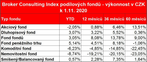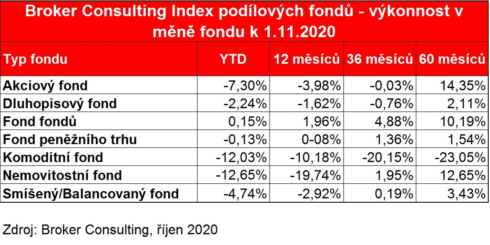 Od začátku roku akciové fondy vykazují výkonnost -2,05 %, v září vykazovaly -3,01 %. Dluhopisové fondy si v říjnu připisují zhodnocení 3,07 %, v září 1,93 % a peněžní fondy vykazují 5,14 %, pro připomenutí v září si připisovaly 3,32 %. Pokles zažily pouze smíšené fondy, které si připisují 0,57 %, v září 1,49 %. Komoditní a nemovitostní fondy vykazují pokles ve všech sledovaných obdobích. Komoditní fondy od začátku roku vykazují pokles -6,23 %, v září to bylo -6,50 %. Nemovitostní fondy si na konci října připisovaly -8,74 %, v září měly pokles -8,90 %. Broker Consulting Index podílových fondů za říjen 2020 uvádí celkové číslo za jednotlivé skupiny fondů. Rozdílná výkonnost fondů v měně fondu a v CZK je dána vývojem měnových kurzů.