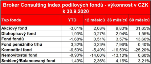 Při pohledu na výkonnost od začátku roku můžeme sledovat, že tři skupiny podílových fondů si připisují zhodnocení. Září nebylo příliš úspěšné pro komoditní a nemovitostní fondy, které spíše stagnovaly, zato ostatní fondy v září posilovaly. Za posledních 60 měsíců se nejlépe dařilo akciovým fondům a fondům fondů. Naopak nejhůře na tom jsou komoditní fondy, které za poslední 60 měsíců vykazují pokles -25,20 %. Vyplývá to z Broker Consulting Indexu podílových fondů za září 2020.