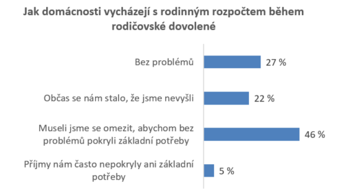 Bezmála tři čtvrtiny českých domácností přiznávají, že v době, kdy byl jeden z rodičů na rodičovské dovolené, nevycházely se svým rozpočtem. Ukázal to aktuální průzkum Poštovní spořitelny, podle něhož pěti procentům dotazovaných příjmy nestačily ani na pokrytí základních životních potřeb.