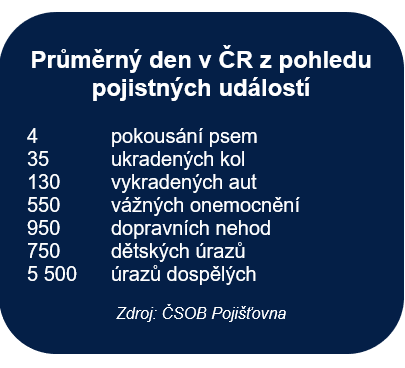 Že Češi životnímu pojištění příliš nerozumí ještě neznamená, že by ho nepotřebovali. Jak vyplývá z interních dat ČSOB Pojišťovny, za jeden den dojde v České republice nejen ke 4 pokousáním psem, ale i k 950 dopravním nehodám, 550 vážným onemocněním a 5 500 úrazům dospělých. S těžkou životní situací, ve které potřebovali právě třeba z důvodu nemoci či úrazu pomoc někoho z blízkých, se podle aktuálního průzkumu setkalo 6 z 10 Čechů. Nejvíce se to přitom týká právě lidí, kteří žijí o samotě – jen pětině se něco takového nikdy nepřihodilo. Zároveň 32,1 % dotázaných chybí někdo, na koho by se mohli spolehnout v podobných situacích.