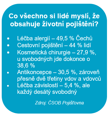 Důvodem může být mimo jiné i špatné povědomí o tom, co všechno životní pojištění zahrnuje. Výsledky průzkumu ukazují, že Češi neví, které služby jsou jeho součástí a které ne. Skoro třicet procent lidí si například nemyslí, že by jim životní pojištění mohlo pomoci v případě úrazu, a pouze 61 % lidí ví, že běžnou součástí pojistky je finanční kompenzace v případě nepříznivých životních událostí. Jen pro srovnání – je to jenom o deset procent více lidí, než kolik si myslí, že životní pojištění zajistí třeba léčbu alergií. Čtyři z deseti svobodných si také myslí, že ze životního pojištění se platí kosmetická chirurgie a 31 % procent dotázaných se domnívá, že pokrývá i antikoncepci – přičemž u vdov a vdovců jde dokonce o celé dvě třetiny.