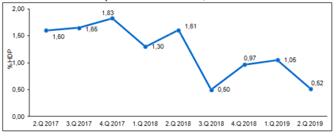 Saldo hospodaření sektoru vládních institucí dosáhlo ve druhém čtvrtletí 2019 přebytku 27,2 mld. Kč, což představuje 1,92 % HDP. Příjmy sektoru vládních institucí dosáhly 42,8 % HDP, zatímco výdaje 40,9 % HDP. Míra zadlužení sektoru vládních institucí klesla meziročně o 2,15 procentního bodu (p. b.) na 33,11 % HDP.