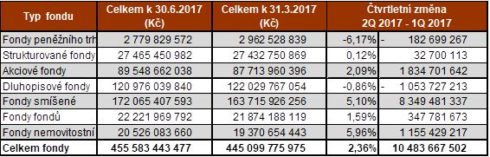 Majetek v podílových fondech vzrostl během druhého čtvrtletí roku 2017 o 10,48 miliardy korun (tj. 2,36%). Z toho hodnota majetku v zahraničních fondech vzrostla o 0,36 miliard korun (tj. o 0,18 %) a domácí fondy zaznamenaly nárůst o 10,12 miliard korun (tj. o 4,09 %). Nárůst majetku zaznamenala aktiva nemovitostních, smíšených, akciových, fondů fondů a strukturovaných fondů. V poklesu pokračují fondy peněžního trhu a dluhopisové fondy.