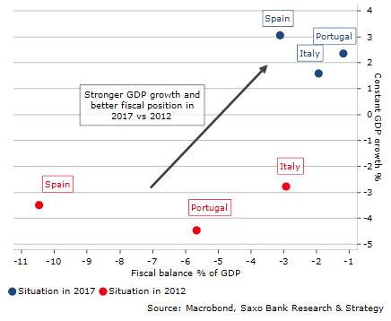 V krátkodobém horizontu jsou tato rizika poměrně vysoká, avšak země PIIGS mají nyní daleko lepší růst i fiskální pozici než v roce 2012. Není žádnou novinkou, že zvýšené politické riziko trhy vždy zneklidní, a to vede k vyššímu rizikovému pojistnému a možnosti rozšíření do finančního sektoru a dalších „slabých“ zemí. Tato nákaza už se skutečně šíří do Španělska a dále. Přesto jsme pro střednědobý horizont optimističtí. Současná ekonomická a finanční situace zemí skupiny PIIGS nemá nic společného se situací v roce 2012 v době evropské dluhopisové krize. Úvěrový impuls v těchto zemích klesá, stejně jako ve většině evropských zemí, což je dáno negativním úvěrovým impulsem Číny a rostoucím protekcionismem, Jejich růst a fiskální pozice jsou však mnohem lepší než před pět lety (viz graf níže).