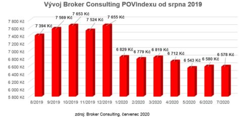 V červenci průměrná cena povinného ručení zůstala v podstatě shodná s tou z června a aktuálně má hodnotu 6 578. Broker Consulting POVIndex sleduje ceny povinného pojištění z provozu vozidla již 12 měsíců v řadě a během nich došlo k meziročnímu poklesu o cca 11 procentních bodů. Nejvyšší cenu za povinné ručení řidiči zaplatili v prosinci 2019. Za částku 6 578 korun bylo možné v červenci podle Broker Consulting POVIndexu sjednat povinné ručení pro vůz Škoda Octavia 1,6 TDI, 85 kW, typický vůz, kterým jezdí české domácnosti.
