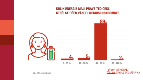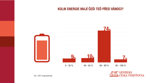 V době pandemie se velmi často mluví o zhoršujícím se psychickém zdraví v celé společnosti. Generali Česká pojišťovna proto zjišťovala, jak moc mají lidé po dvou letech pandemie „vybité“ baterky. „Využili jsme metafory s baterií u telefonu. Lidé měli určovat, na kolik procent se cítí nabití. Tři čtvrtiny (74 %) respondentů uvedlo, že se cítí být před svátky nabití na 60–80 % své energetické kapacity. To považujeme za dobrou a také povzbudivou zprávu,“ říká Markéta Filová, senior manažerka životní pojištění z Generali České pojišťovny.
