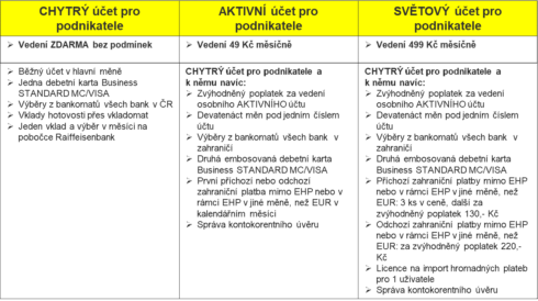 Podnikatelské účty jsou nyní tři. Chytrý a Aktivní v podstatě kopírují osobní účty. Třetí možností je podnikatelský Světový účet za 499 Kč měsíčně, který je určen klientům využívajícím zahraniční platební styk. Podrobnější podobu podnikatelských účtů naleznete v následující tabulce.